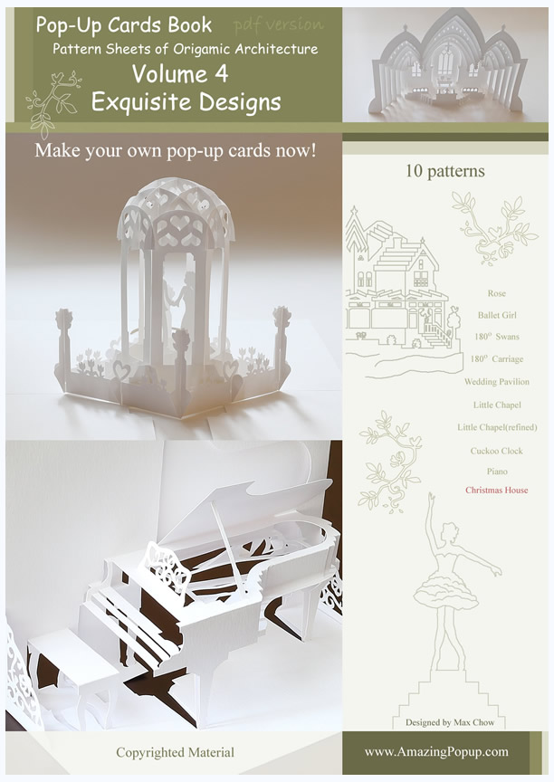 Again, the card models are suitable for living decorations to add an artistic spirit or as a gift for someone special. We suggest beginners begin with the simpler patterns before advancing to the more challenging models. This progressive approach aids in skill development and boosts confidence in kirigami. The book provides pattern sheets, reference photos, and detailed instructions to guide you on your creative path. Rest assured, all the cards in this book are designed to fold and flatten completely. Most of the pop-up models don't require glue or tape to complete. The Carriage and the two Chapels stand out as exceptions, slightly glued is needed.